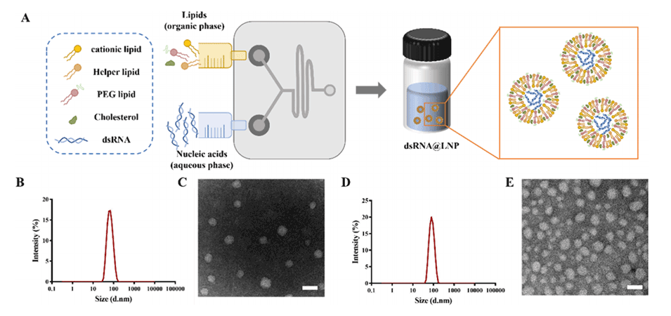 图3.(A)使用SHM制备dsRNA@LNP的示意图。将四种脂质溶解在酒精中作为有机相,dsRNA分子溶解在柠檬酸缓冲液中作为水相。(B)对制备的LNP进行DLS分析。(C)LNP的TEM图像。比例尺:100nm。(D)制备的dsCHSB@LNP的DLS分析。(E)dsCHSB@LNP的TEM图像。比例尺:100nm。