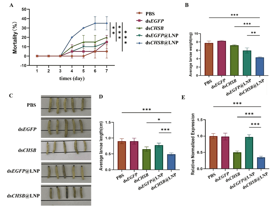总之,与单独使用dsCHSB相比,dsCHSB@LNP在甜菜夜蛾幼虫中表现出更高的杀虫活性、更强的生长抑制作用和更佳的基因抑制效率。LNP的包封可以保护dsRNA免受核酸酶降解,增强dsRNA的稳定性和细胞内递送能力,从而提高RNAi效果。