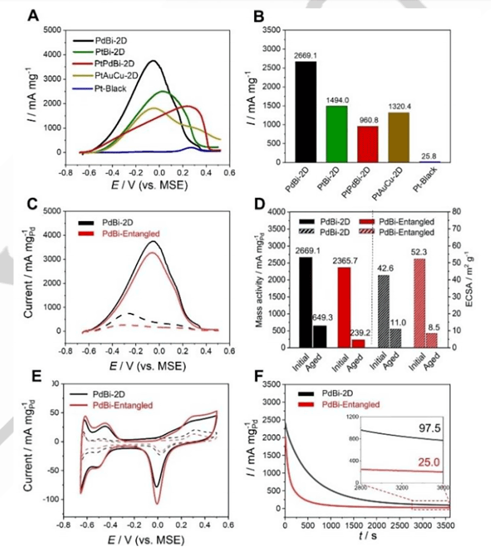 图3.(A)2D MNWNs(PdBi、PtBi、PtPdBi和PtAuCu)和铂黑在0.1mol/L HClO4+0.5mol/L HCOOH中的正向扫描曲线;扫描速率为50mV/s:(B)FAOR的质量活性比较图。(C,E)PdBi2DMNWNs和PdBi分别在0.1mol/L HClO4+0.5mol/L HCOOH和0.1mol/L HClO4中进行1000个循环之前(实线)和之后(虚线)的CV曲线。(D)在-0.2V(vs.MSE)下进行耐久性测试前后的ECSA和质量活性的比较图。(F)在-0.2V(vs.MSE)下测得的计时电流曲线。
