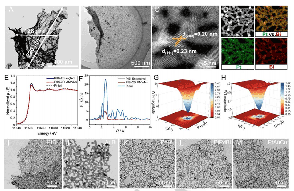 图2.(A)PtBi粒子的光学显微照片图像。(B)PtBi 2D MNWNs的TEM图像。(C-D)2D MNWNs的HAADF-STEM图像和EDX图谱。(E)Pt-L3边缘XANES光谱。(F)FT-EXAFS光谱。(G-H)Pt箔和PtBi-2D MNWNs的EXAFS图谱的WTs。(I-M)不同成分的2D MNWNs的TEM图像:分别为PtBi、AuBi、PdBi、PtPdBi和PtAuCu。