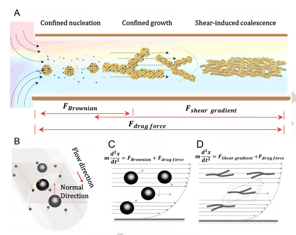 图1.(A)微流控系统中2D MNWNs的形成:i)二维空间受限成核,ii)生长和初始聚集,iii)剪切诱导形成大尺度二维结构。(B)微流控反应通道的横截面。(C)层流中的刚性球体代表原始粒子的运动,适用于处于成核和生长阶段的粒子。(D)层流中的二维薄片,适用于处于剪切诱导聚结阶段的颗粒。