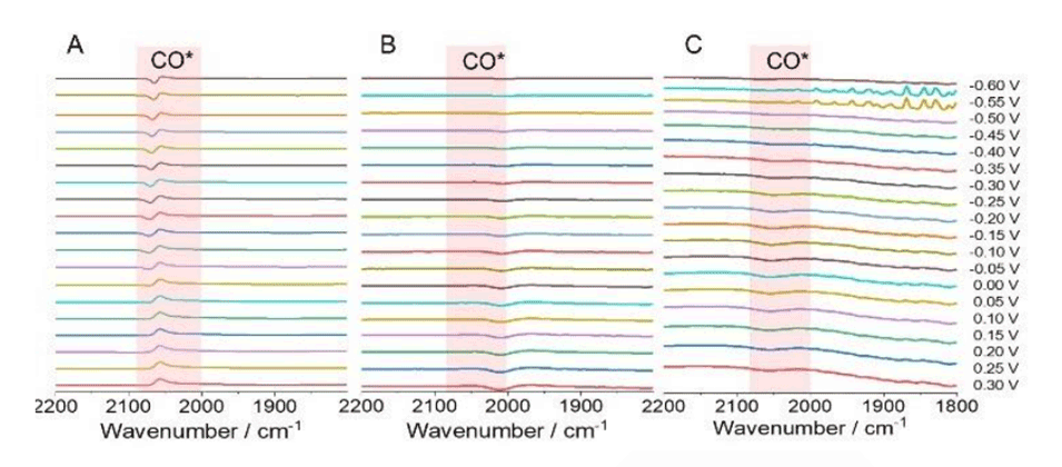图4.在FAOR过程中,记录了(A)Pt/C、(B)PtBi-2D MNWNs和(C)PdBi-2D MNWNs催化剂在-0.6至0.3V(vs.MSE)范围内的原位傅立叶变换红外光谱。