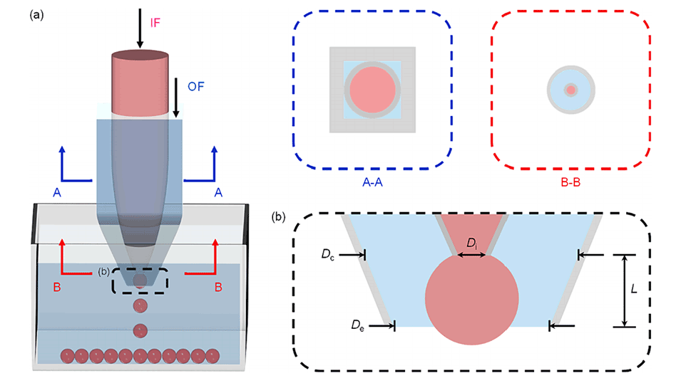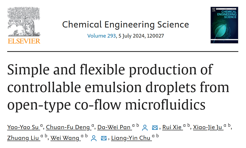 近期,四川大学汪伟教授&潘大伟副教授团队开发了一种开放式共流微流控技术,该技术可通过简单的微流操控,在广泛的流量范围内可控生成均匀的乳化液滴。相关研究以“Simple and flexible production of controllable emulsion droplets from open-type co-flow microfluidics”为题目发表于期刊《Chemical Engineering Science》。