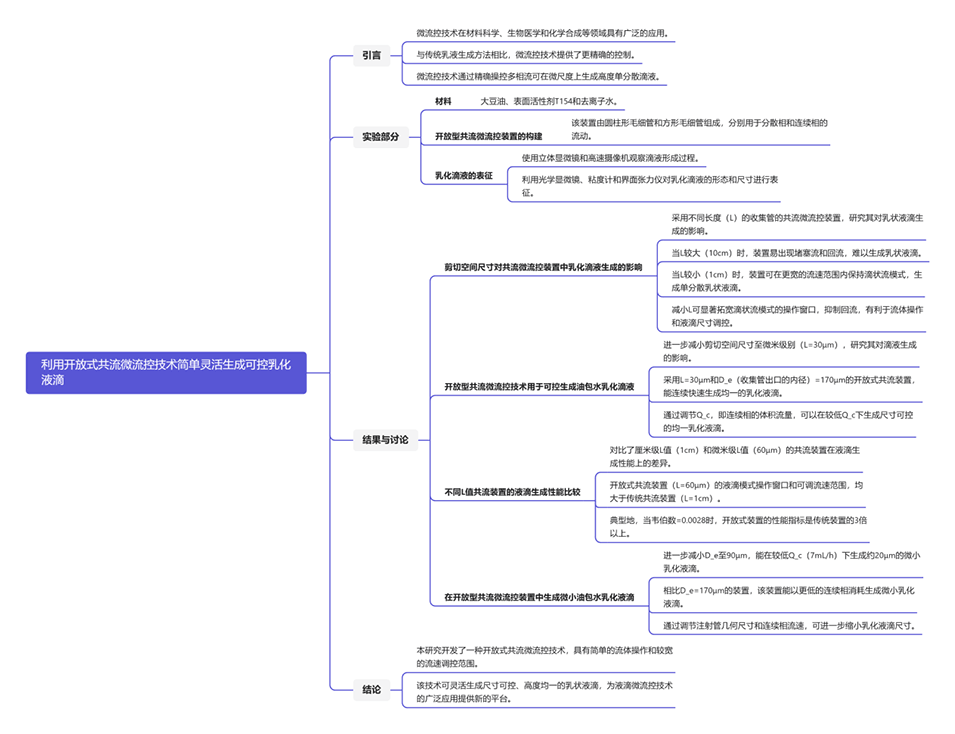 总的来说,开放式共流微流控技术为可控生成具有广泛尺寸范围的均匀乳化液滴提供了简单、灵活且高效的平台。