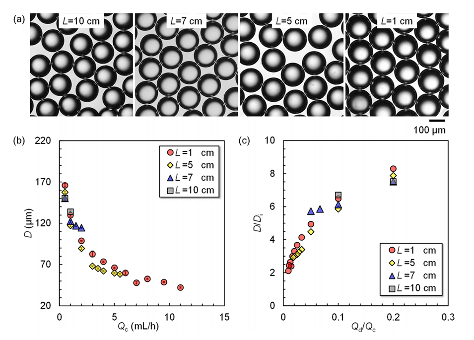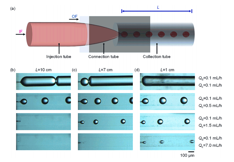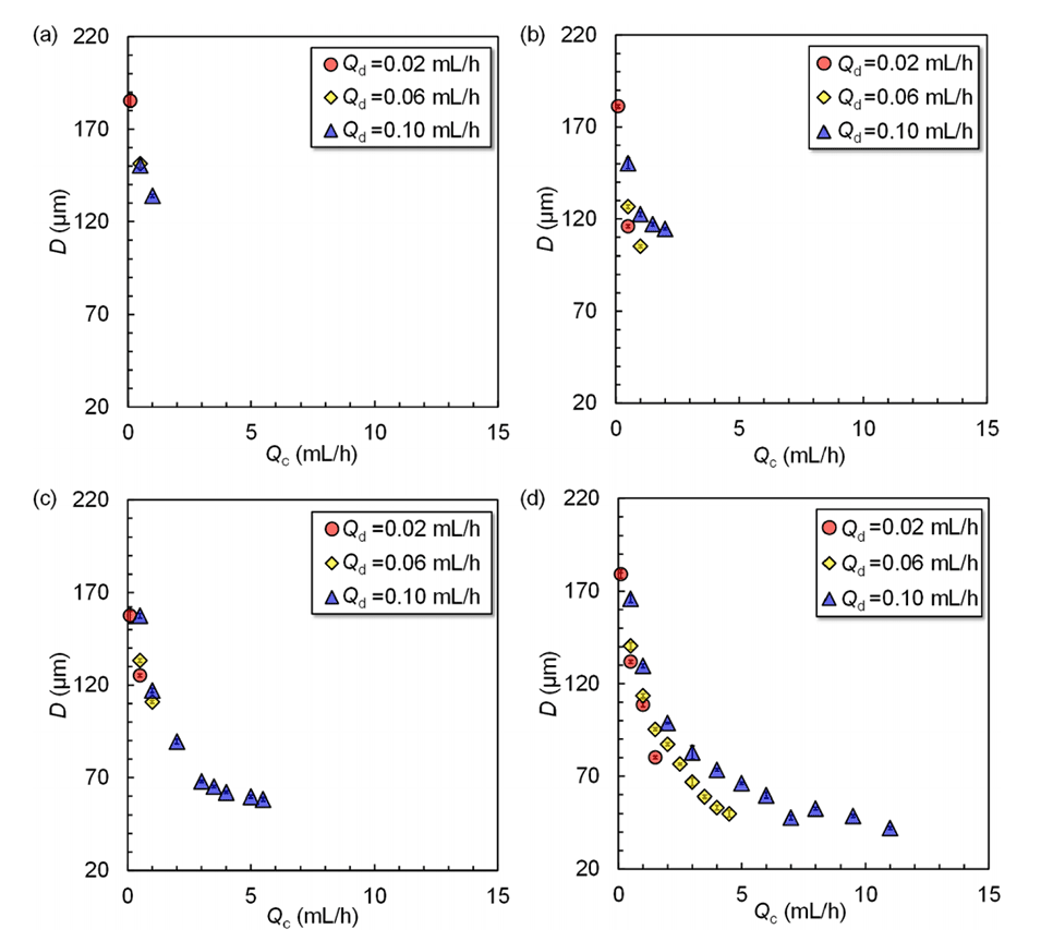 图4.在共流微流控装置中,随着L值变化,即10cm(a)、7cm(b)、5cm(c)和1cm(d),液滴直径随流量变化的调控情况。