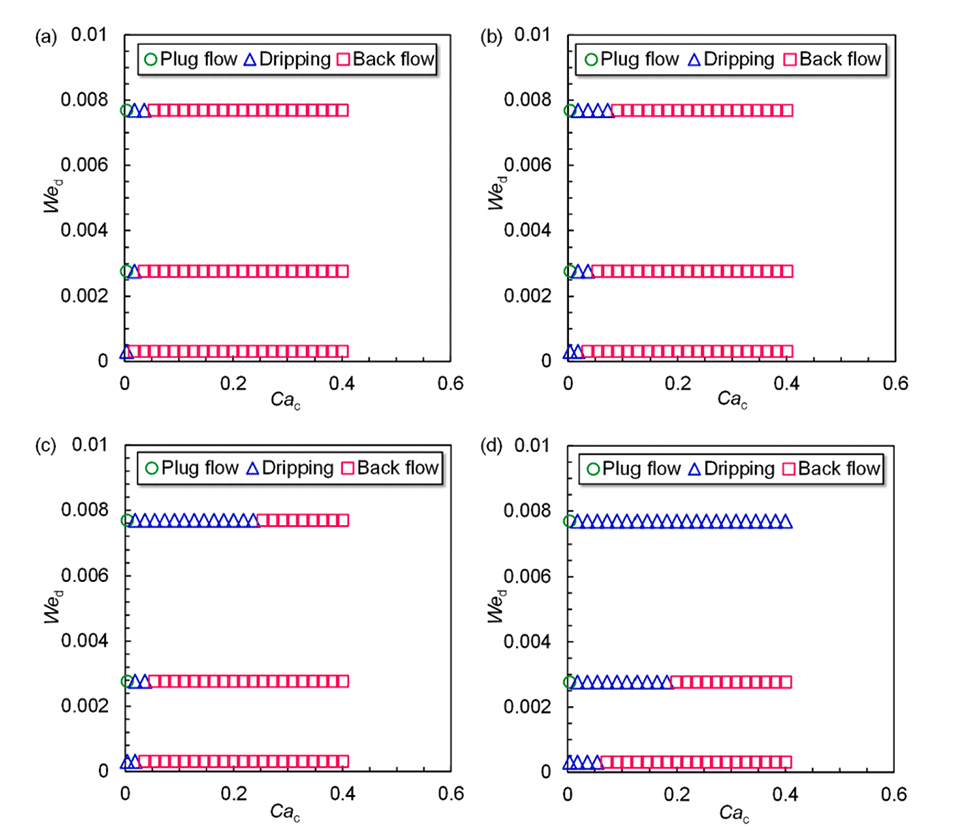 图8.在厘米尺度和微米尺度L值的共流微流控装置中,流量变化对液-液流态的影响。