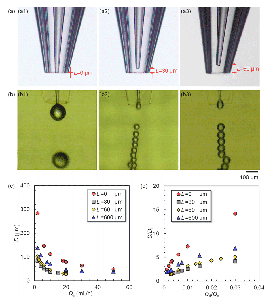 图2.具有不同剪切空间尺寸的共流微流控装置用于乳化液滴生成。