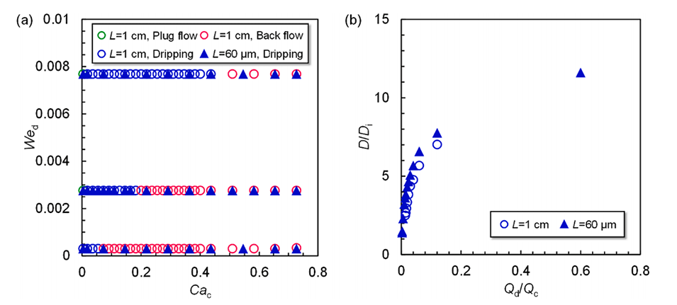 图9.L=1cm和L=60μm的共流微流控装置生成乳化液滴的操作条件。