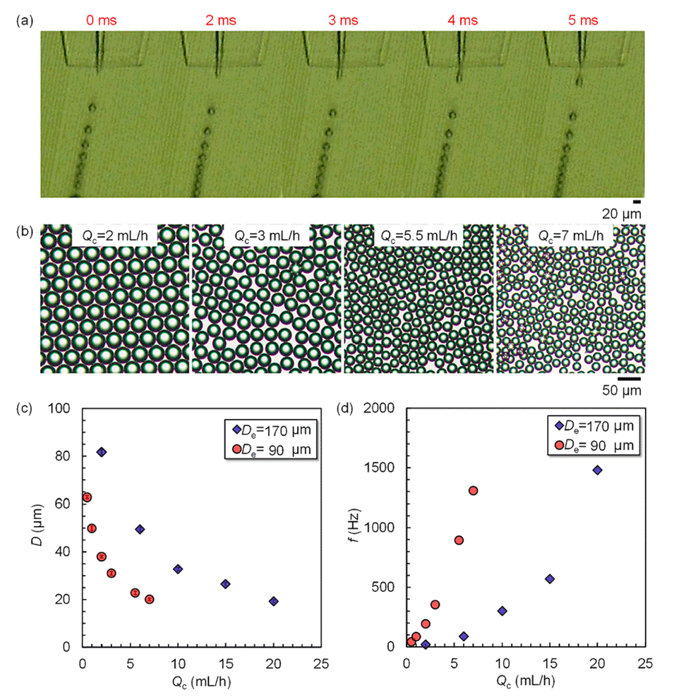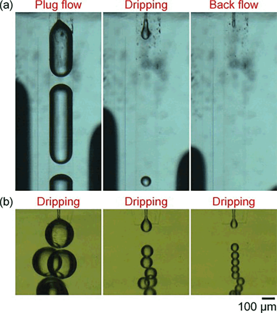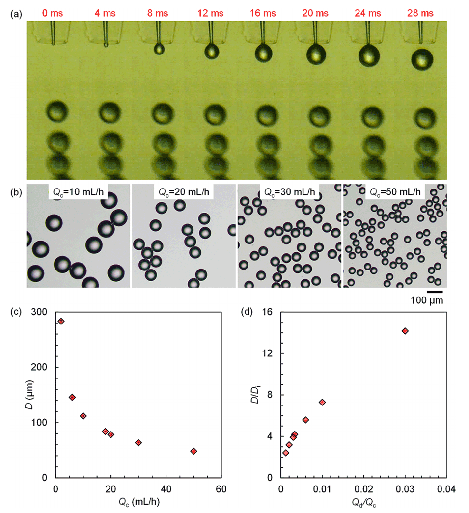 图5.共流微流控装置中油包水乳化液滴的可控生成。