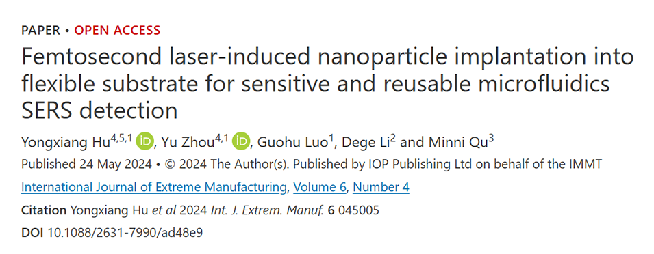 近期,上海交通大学胡永祥教授团队提出了一种飞秒激光诱导纳米粒子阵列(NPA)植入柔性基底的新颖方法。该方法通过调节激光偏振方向,实现了金NPA在柔性聚二甲基硅氧烷(PDMS)膜上的均匀正向转移,并将其精确集成到微流控芯片中用于SERS检测。相关研究以“Femtosecond laser-induced nanoparticle implantation into flexible substrate for sensitive and reusable microfluidics SERS detection”为题目,发表在期刊《International Journal of Extreme Manufacturing》上。