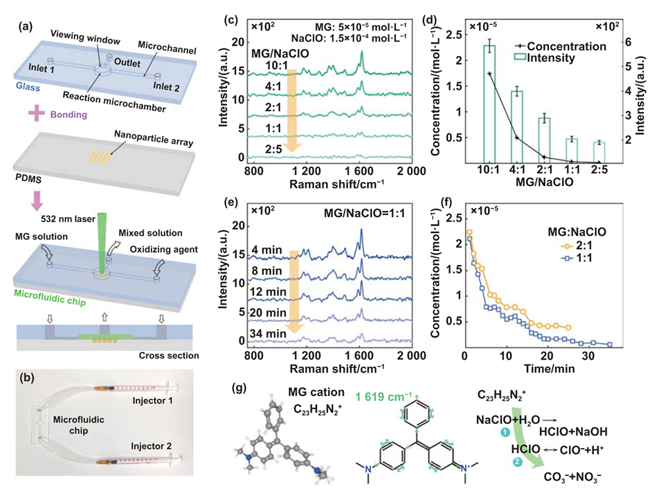4、为了展示Au-NPA的性能,建立了SERS微流控系统来监测MG/NaClO反应物之间的在线氧化反应,有助于推断反应路径。