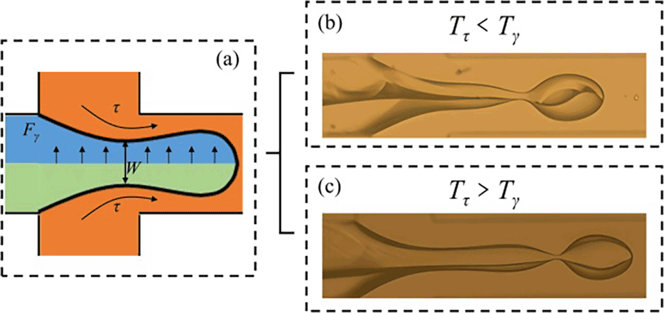 图4.(a)液体扩散过程与缩颈过程之间的竞争。(b)Janus机制图。(c)核壳机制示意图。Tτ表示颈部破裂所需的时间,Tγ表示吞没所需的时间。