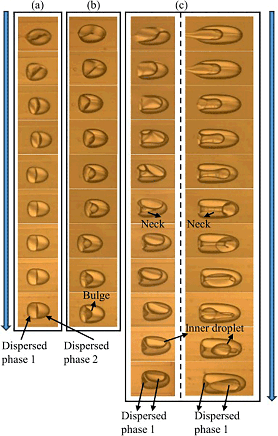 4、在剪切应力和界面张力的共同作用下,观察到双乳液液滴的三种形态。