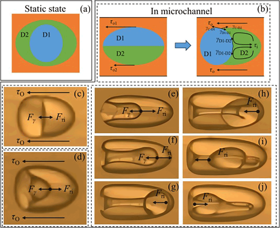 图6.(a)静态双乳液液滴的形态图。(b)微通道中液滴的受力分析和形态变化图。(c)形态I液滴的受力分析。(e-j)形态III液滴的受力分析。