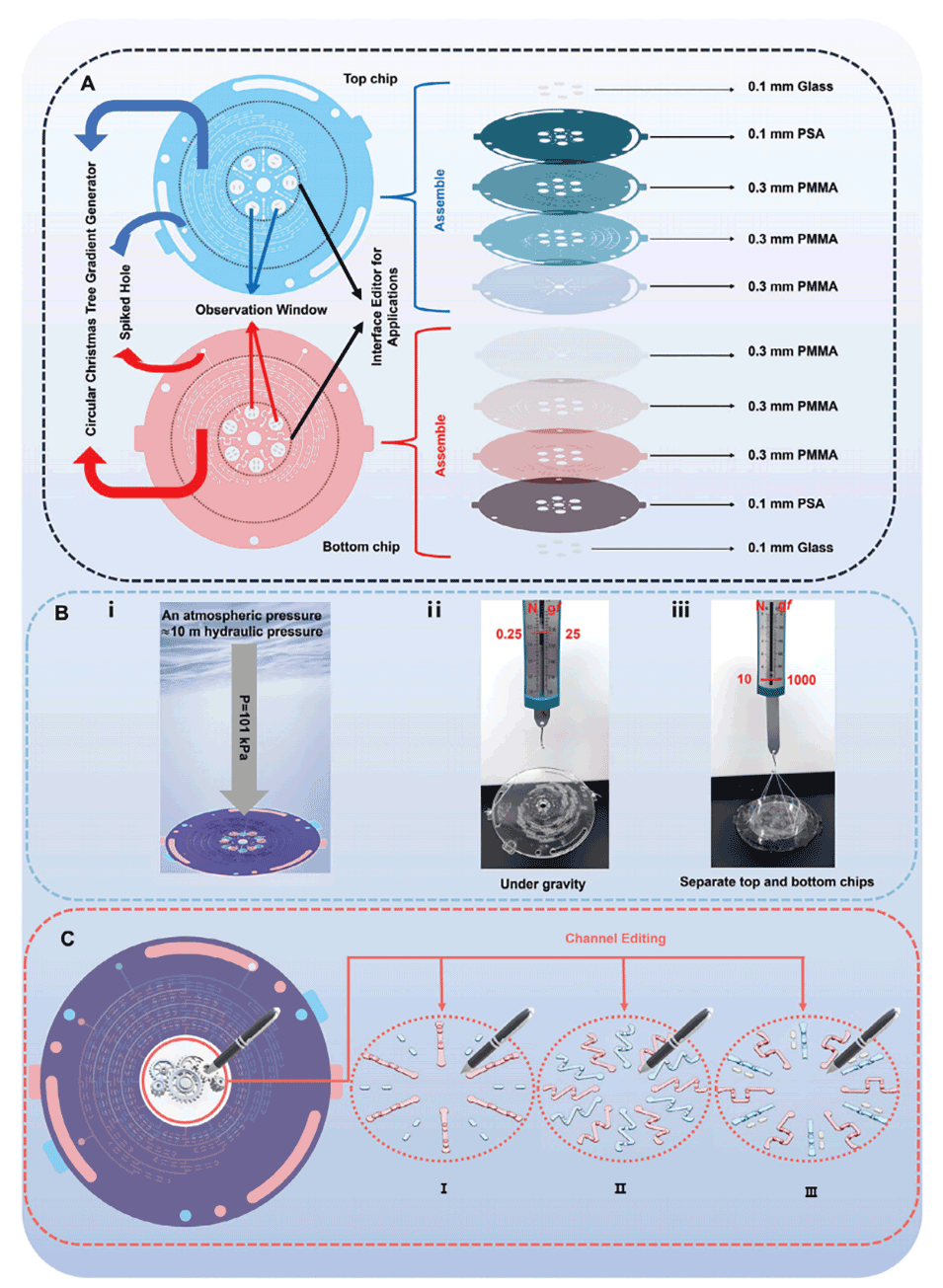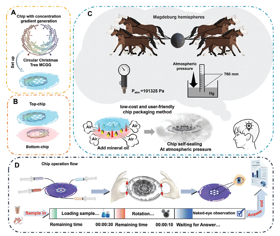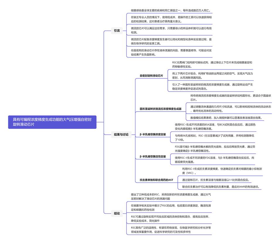 1、受马德堡半球的启发,本研究利用无处不在的大气压力实现旋转-滑动芯片(RSC)的自密封,该芯片配备了三维圆形圣诞树状微流控浓度梯度发生器,可用于各种环境下的微生物研究和测试。