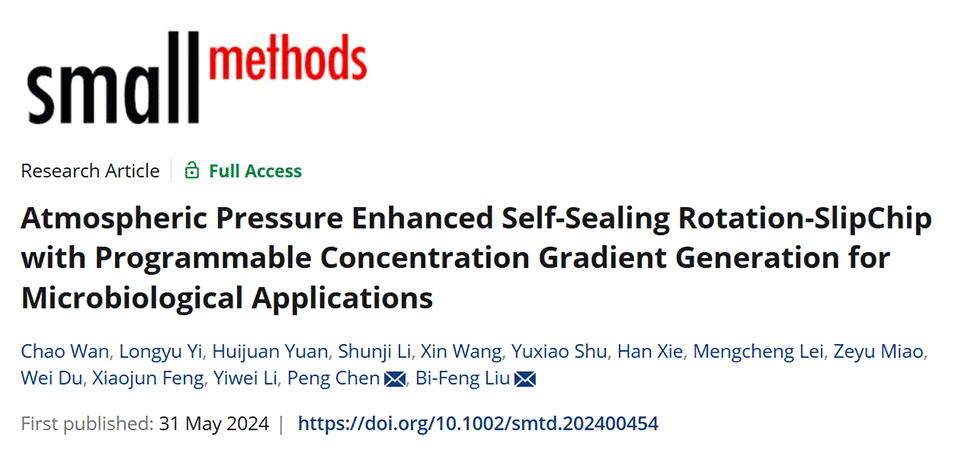 近日,华中科技大学刘笔锋教授、陈鹏副教授团队开发了一种新型微流控装置——大气压增强自封闭旋转滑动芯片(RSC),该装置配备了可编程浓度梯度生成器,为各种环境下的微生物研究和测试提供了一个方便易用的平台。相关研究以“Atmospheric Pressure Enhanced Self‐Sealing Rotation‐SlipChip with Programmable Concentration Gradient Generation for Microbiological Applications”为题目,发表在期刊《Small Methods》上。
