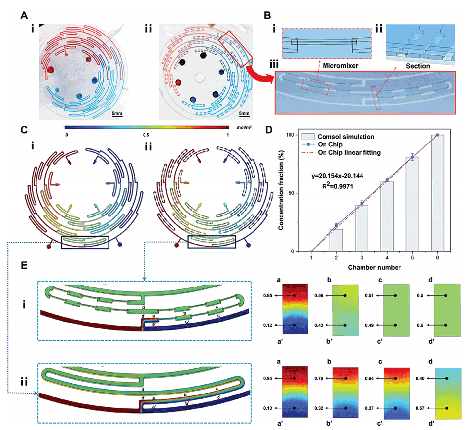 图3.A)生成红色和蓝色颜料浓度梯度的圆形圣诞树浓度梯度发生器,(i)不带微混合器,(ii)带微混合器。B)(i)微混合器,(ii)微混合器部分,(iii)由多个微混合器组成的混合器单元。C)有无微搅拌器的数值模拟结果:(i)无微搅拌器,(ii)有微搅拌器。D)RSC能够生成具有线性浓度梯度的溶液(R2=0.9971)。E)4个相对位置节段的浓度。(i)无微混合器,(ii)有微混合器。