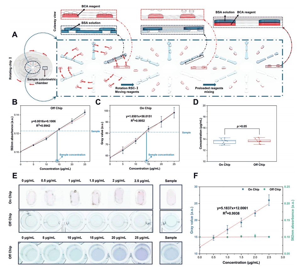 图4.A)旋转RSC-I,使标准BSA浓度梯度溶液与BCA试剂混合。B)在96孔板上测定β-半乳糖苷酶蛋白浓度,并进行线性相关分析(R2=0.9942)(n=3)。样品线表示待测样品的吸光度值。C)在RSC中测定β-半乳糖苷酶蛋白浓度,并进行线性相关分析(R2=0.9952)(n=3)。样本线表示待测样品的灰度。D)芯片内与芯片外实验结果的比较,以及两组实验结果的显著性分析(P>0.05)(n=10)。E)RSC-I的检测限可降低10倍。F)芯片内和芯片外低浓度实验结果的线性分析(左侧刻度对应片上,右侧刻度对应片外)。使用RSC可以生成标准蛋白质曲线(R2=0.9938),用于低浓度下的蛋白质定量。