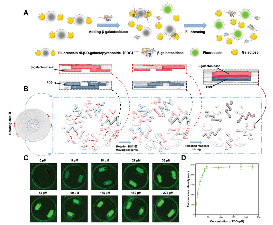 图5.A)用β-半乳糖苷酶水解FDG,释放出荧光素。B)旋转RSC-II,使具有FDG浓度梯度的溶液与β-半乳糖苷酶混合。C)反应结束时各反应室的荧光强度。D)50nM β-半乳糖苷酶条件下荧光强度与FDG浓度的关系(n=3)。
