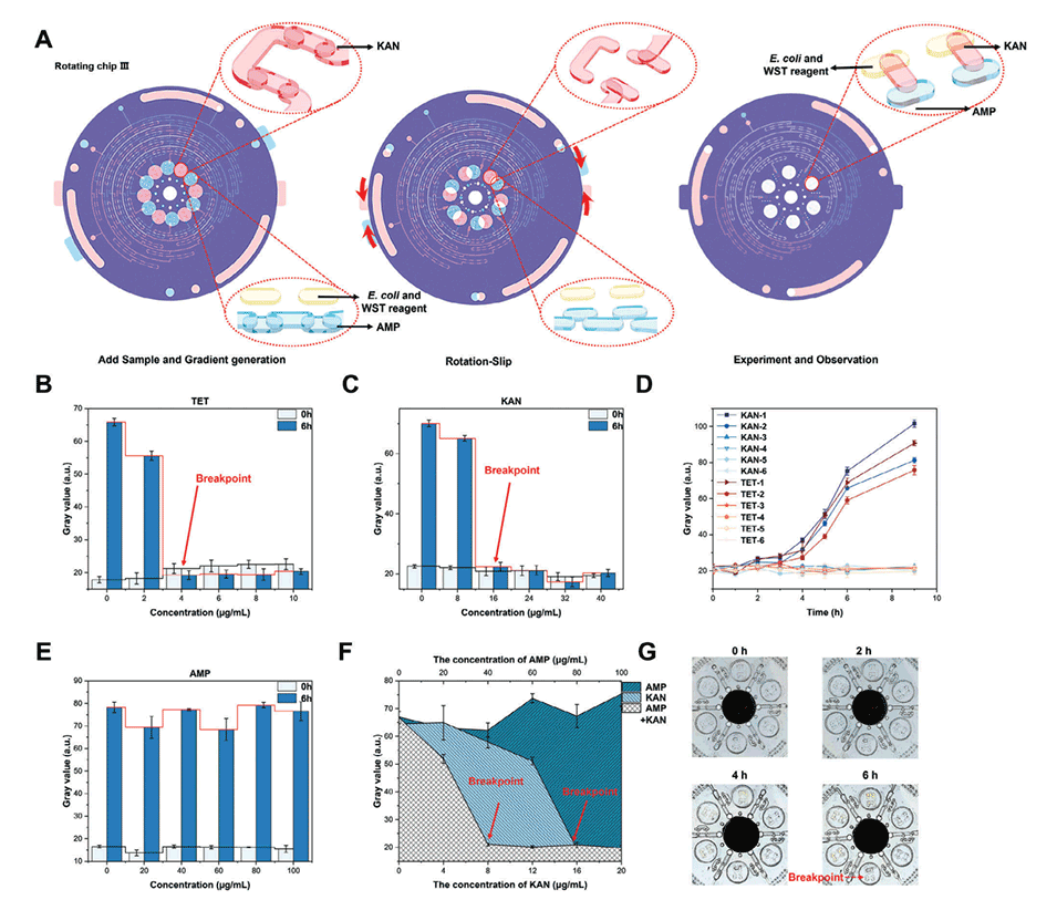 图6.A)旋转RSC-III可使AMP浓度梯度溶液和KAN浓度梯度溶液同时与细菌接触。B)通过分析四环素(TET)药敏试验中0小时和6小时的灰度值,断点为4μg/mL(n=3)。C)通过分析卡那霉素(KAN)药敏试验中0小时和6小时的灰度值,断点为16μg/mL(n=3)。D)TET和KAN药敏试验中灰度值与反应室时间之间的关系。E)通过分析氨苄西林(AMP)药敏试验中0小时和6小时的灰度值,发现大肠杆菌对AMP具有抗药性(n=3)。F)KAN和AMP联合使用可有效降低两种抗生素的最小抑菌浓度(n=3)。G)抗生素组合结果可直接通过肉眼观察获得。
