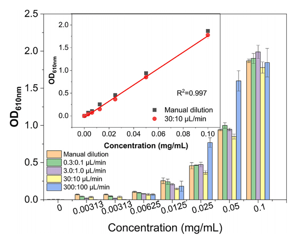 图4.微流控芯片出口处的浓度准确性。在不同的入口流速(即300μL/min:100μL/min、30μL/min:10μL/min、3μL/min:1μL/min和0.3μL/min:0.1μL/min)下,对芯片上连续稀释0.1mg/mL亚甲基蓝的浓度梯度进行了评估。内嵌图表说明了片上稀释和手动稀释方法的光密度(OD)与浓度的线性相关关系。
