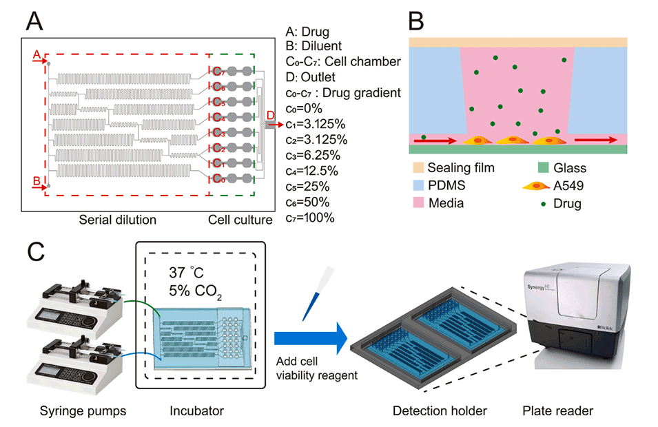 芯片设计中包含两个注射泵,分别用于输送药物溶液和稀释液(培养基)。