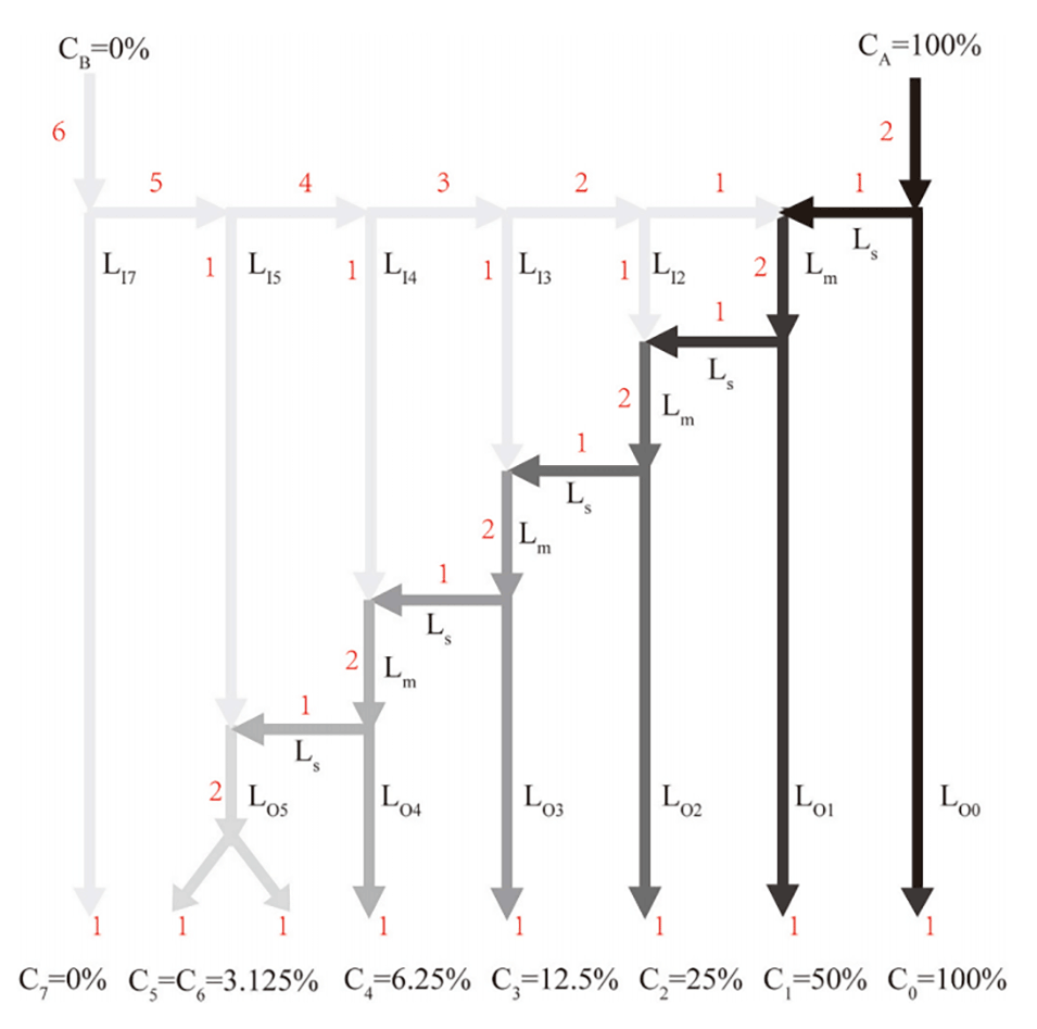 图2.1:2连续稀释微流控网络的电子类比结构。每个通道的流速用红色表示。CA、CB、C0-7表示药物浓度梯度。混合通道的长度用Lm表示,LO0-LO5和LI1-LI7表示其余通道的长度。