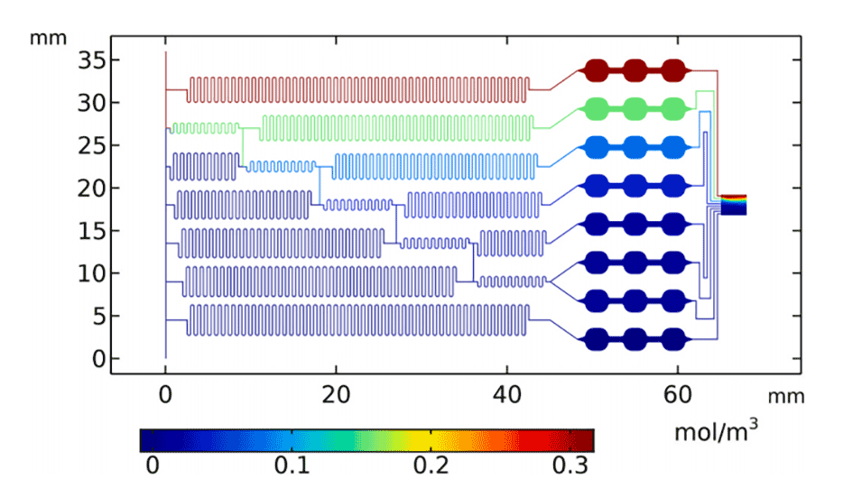 图3.COMSOL Multiphysics 5.4模拟的片上连续稀释模块的浓度分布。0.31mM(0.1mg/mL)的亚甲基蓝溶液和水分别用作原液和稀释液。稀释剂和药物的入口流速分别为3μL/min:1μL/min。每个细胞室和混合通道中的溶液浓度用色条表示(mM),其中红色和蓝色分别表示100%浓度和0%浓度的原始亚甲基蓝溶液。