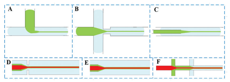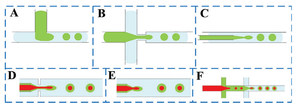 图4.交叉点的几何形状:A)交叉流、B)流动聚焦和C)共流。D)流动聚焦微流控装置。E)同轴共流微流控装置。F)双流动聚焦微流控装置