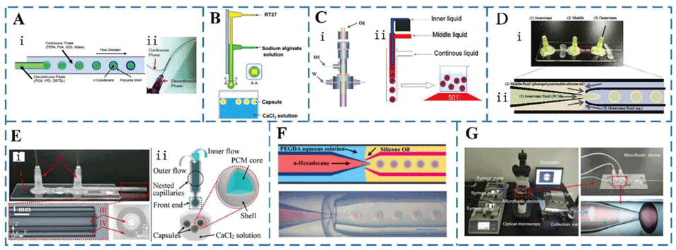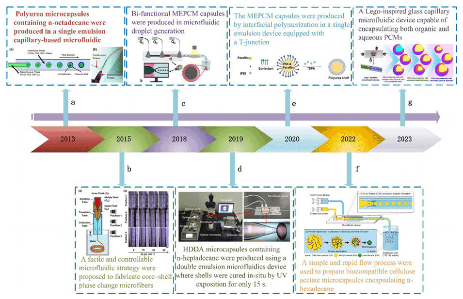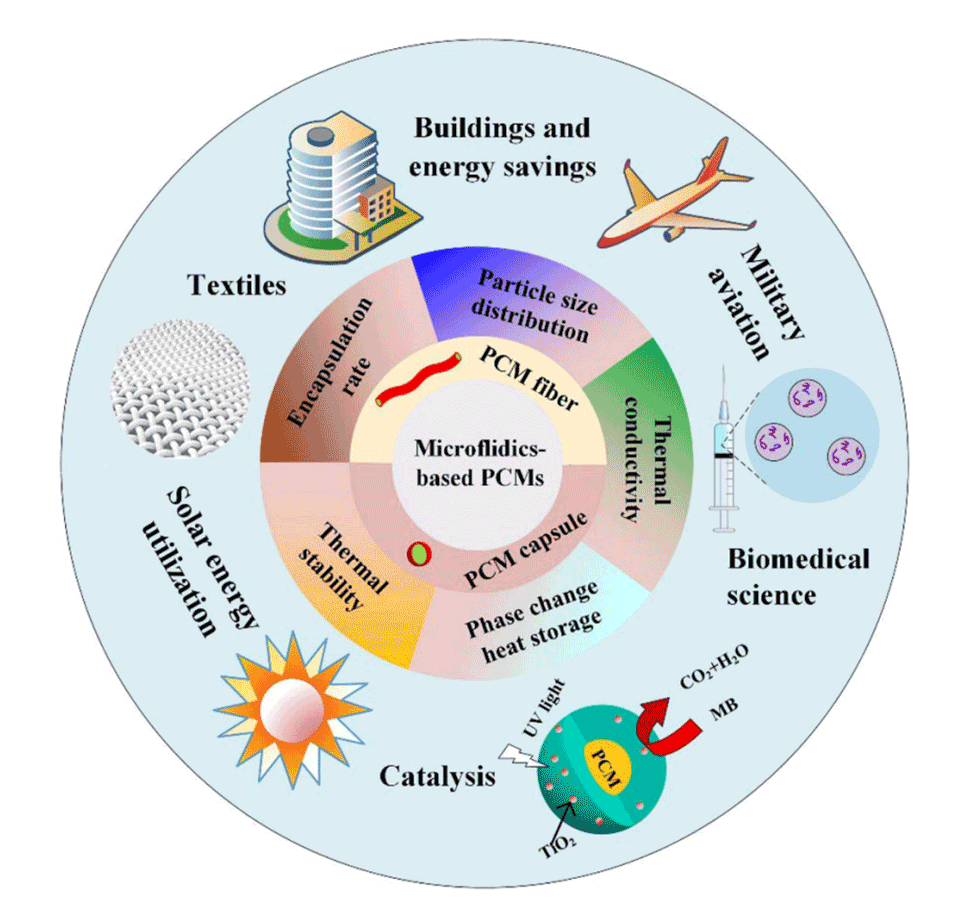 尽管PCM作为热储存介质已被广泛使用,但在实际应用中,PCM存在导热率低、易泄漏和腐蚀等局限性。为了克服这些挑战,可以将PCM封装到微封装相变材料(MEPCM)胶囊/纤维中。这种封装可防止PCM出现泄漏和腐蚀问题,而微胶囊/纤维则可作为热传导管道,实现PCM与周围环境之间的有效热量交换。过去十年来,基于微流控技术的MEPCM因其对流动条件和微胶囊尺寸的精细控制而备受关注。