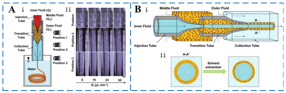 图9.A)利用同轴毛细管微流控装置制备MEPCM纤维。B)制成的具有芯鞘结构的复合相变微纤维的示意图