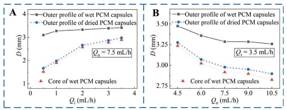 图8.详细直径与A)内流速率Qi和B)外流速率Qo之间的关系