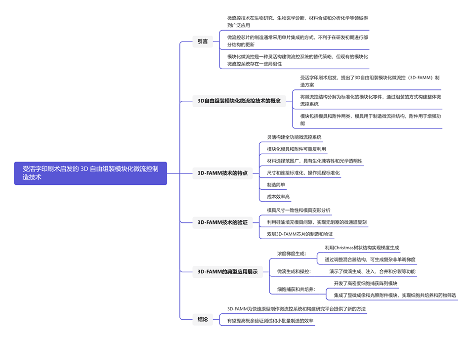 1、受活字印刷术的启发,本研究提出了一种3D模块化微流控(3D-FAMM)制造技术,通过复刻组装模块来制造双层3D微流控系统。
