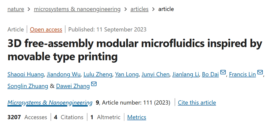 近期,上海理工大学张大伟教授、戴博教授团队提出了一种受活字印刷技术启发的3D模块化微流控方案,并开发了一系列加工模具,以实现对微流体和微液滴的复杂操控。相关研究以“3D free-assembly modular microfluidics inspired by movable type printing”为题目发表于期刊《Microsystems & Nanoengineering》。