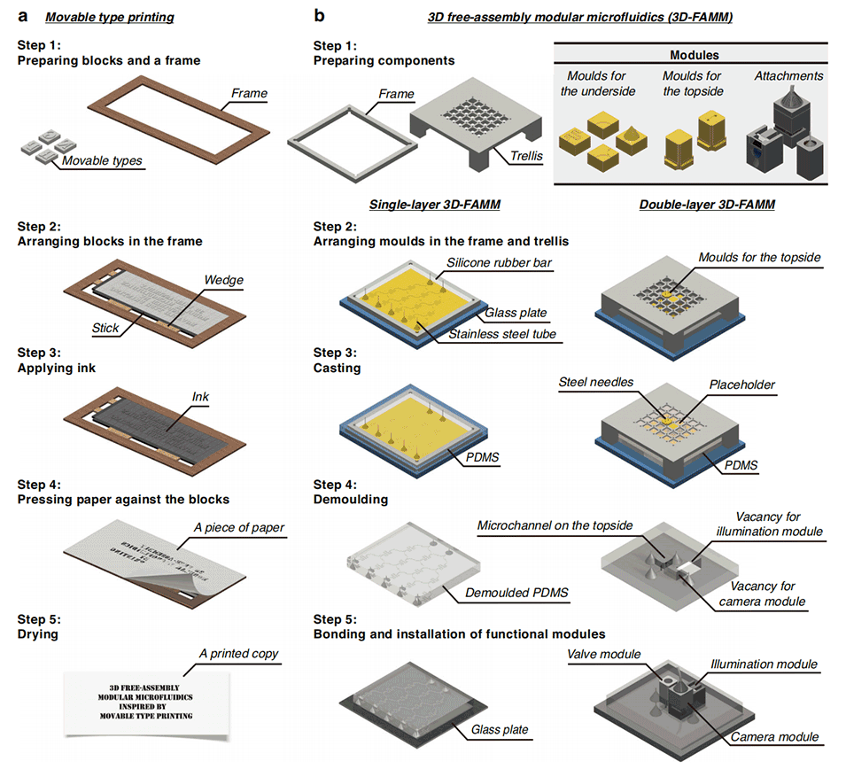 图1.活字印刷和3D自由组装模块化微流控制造技术原理图。
