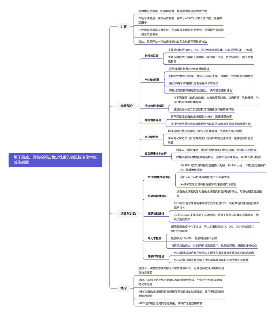 1、本研究开发了一种微流控电化学集成传感器(MEIS),能够快速、高效分离和灵敏检测白色念珠菌(albicans)。