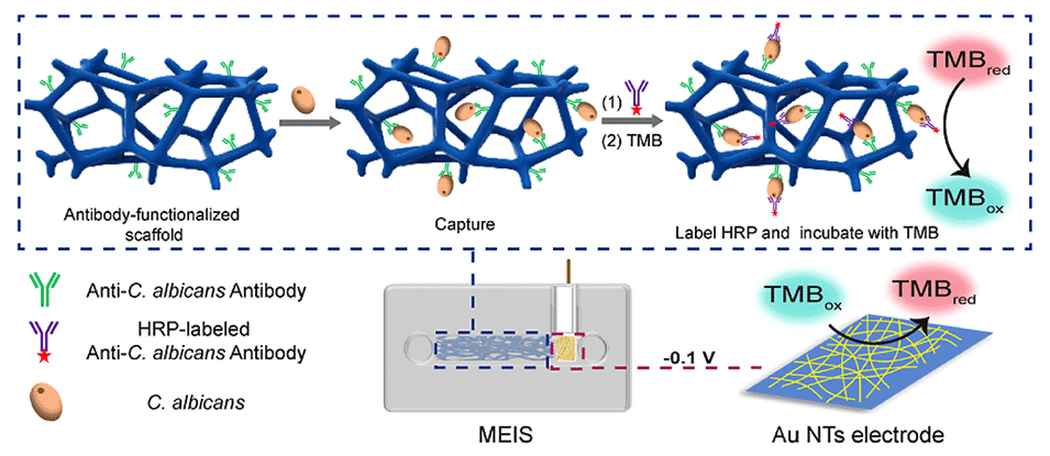 传统的病原菌检测方法耗时长、效率低、灵敏度差,影响了感染控制和疾病诊断。因此,寻找解决这些问题的解决方法对于临床诊断病原性疾病和指导抗生素的合理使用具有重要意义。近期,武汉大学谢敏副教授团队提出了一种微流控电化学集成传感器(MEIS),能够快速、高效地分离和灵敏检测白色念珠菌(Candida albicans)。本文主要讨论了传统白色念珠菌检测方法面临的挑战,对快速准确检测方法的需求,以及微流控电化学检测技术的优势。相关研究以“Microfluidic Electrochemical Integrated Sensor for Efficient and Sensitive Detection of Candida albicans”为题目,发表在期刊《Analytical Chemistry》上。