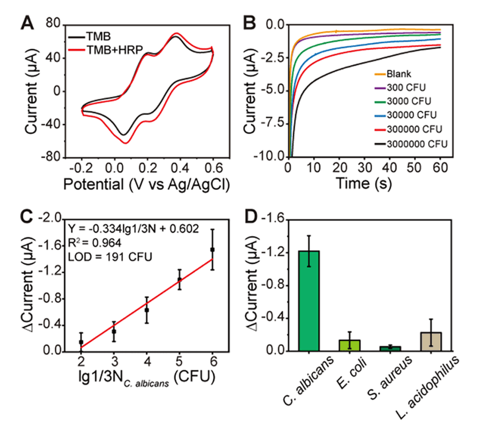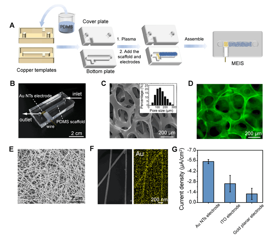 图1.(A)MEIS的制造过程。(B)MEIS的照片。(C)三维PDMS支架的SEM图像。插图显示了三维PDMS支架的大孔尺寸统计图。(D)抗白色念珠菌抗体功能化三维PDMS支架的表征。DyLight 488标记的山羊抗兔二抗。(E)Au NT电极的SEM图像。比例尺:2μm。(F)Au NT电极的SEM(左)和EDX(右)图像。比例尺:200nm。(G)Au NT电极、ITO电极和金平面电极的灵敏度。