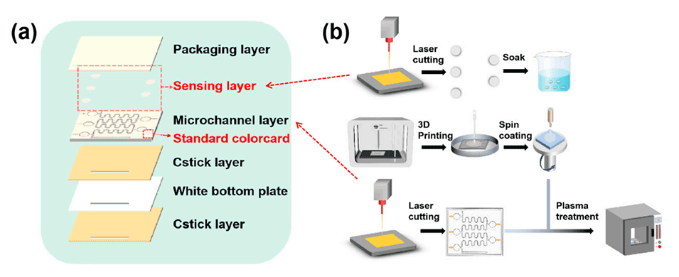 图1.(a)微流控汗液葡萄糖监测贴片的整体构造。(b)微流控汗液监测贴片的制备流程图。