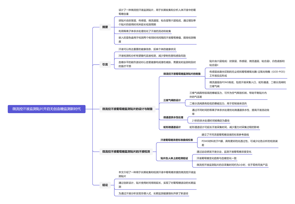 1、本研究设计了一种微流控汗液监测贴片,用于长期收集人体汗液并检测其中葡萄糖含量的波动。该贴片由封装层、传感层、微流道层、粘合层等六层组成。