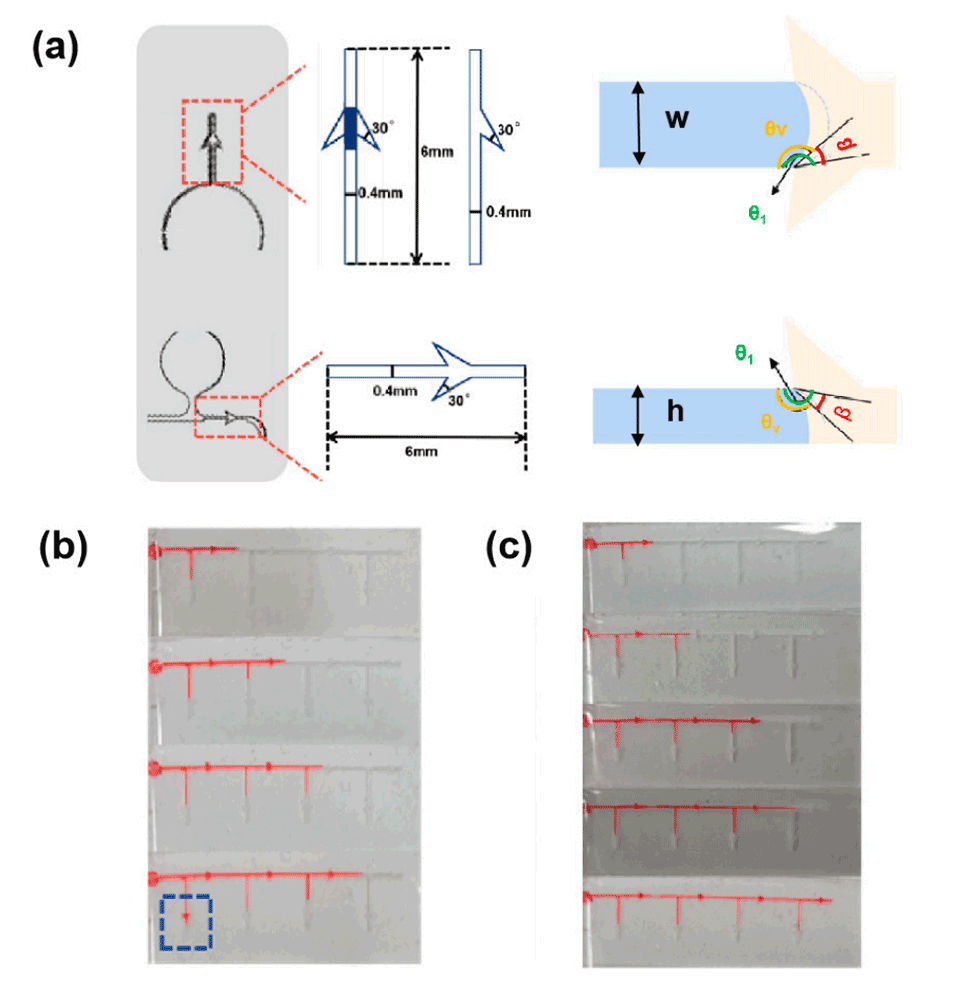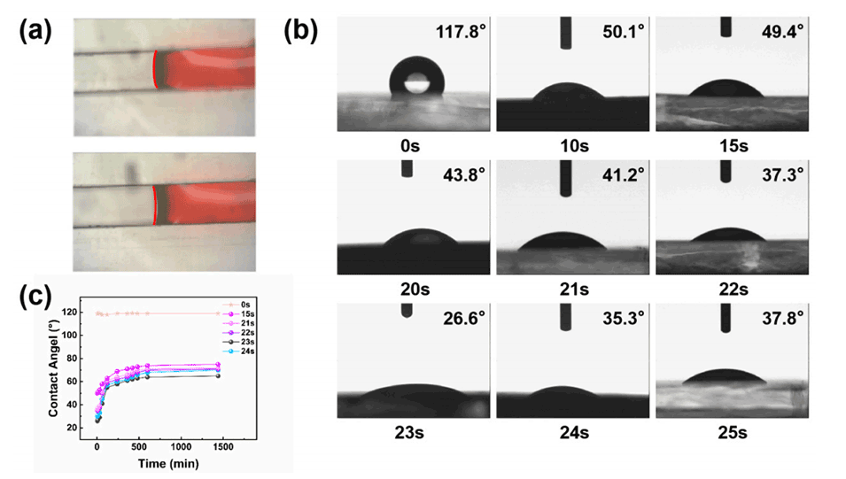 图3.(a)疏水和亲水通道中液体前端表面的形状。(b)不同亲水处理持续时间下PDMS的水接触角。(c)不同亲水时间(5分钟、10分钟、30分钟、1小时、2小时、4小时、6小时、7小时、8小时、10小时和24小时)下PDMS的水接触角。