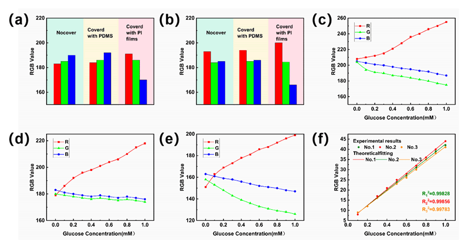 图6.(a)覆盖上封装层后未发生显色反应的显色盘的RGB值。(b)覆盖上封装层后发生显色反应的显色盘的RGB值。(c-f)不同光源照射色环时的RGB值:(c)2.5W白光;(d)5W白光;(e)3W黄光。(f)将不同浓度葡萄糖溶液在不同光照(1号:2.5W白光;2号:5W白光;3号:3W黄光)下的∆R值拟合到比色盘上,得到标准参考曲线。