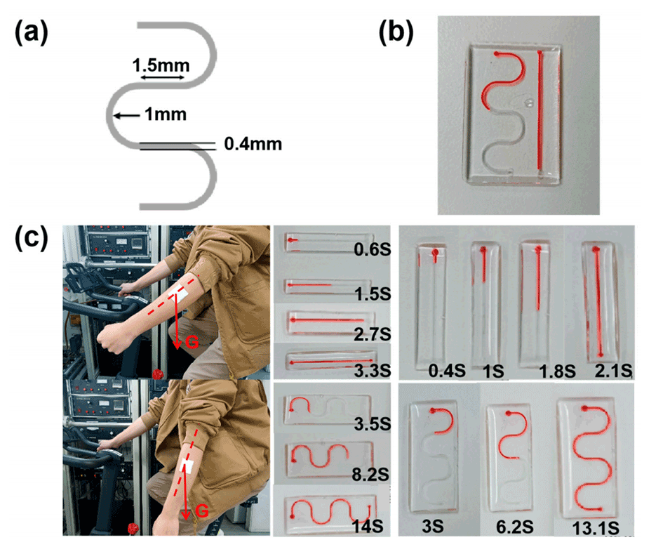 图5.(a)蛇形通道结构示意图。(b)蛇形通道与直通通道的流速对比图。(c)随着志愿者摆臂的移动,微流控贴片相对于重力的角度变化光学示意图,以及水平和垂直放置时,直通通道和蛇形通道的收集时间长度。