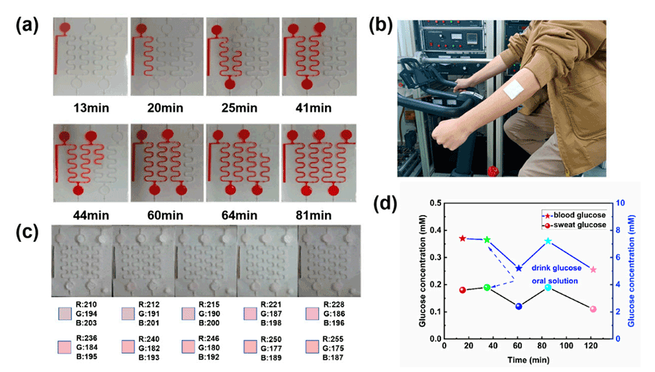 图7.(a)体外模拟注射泵注入红色染料的流动路径和收集时间。(b)贴在志愿者手臂上的微流控汗液葡萄糖监测贴片的光学视图。(c)显色盘显示佩戴微流控汗液葡萄糖监测贴片的志愿者的汗液葡萄糖检测结果。(d)汗液葡萄糖动态监测结果。