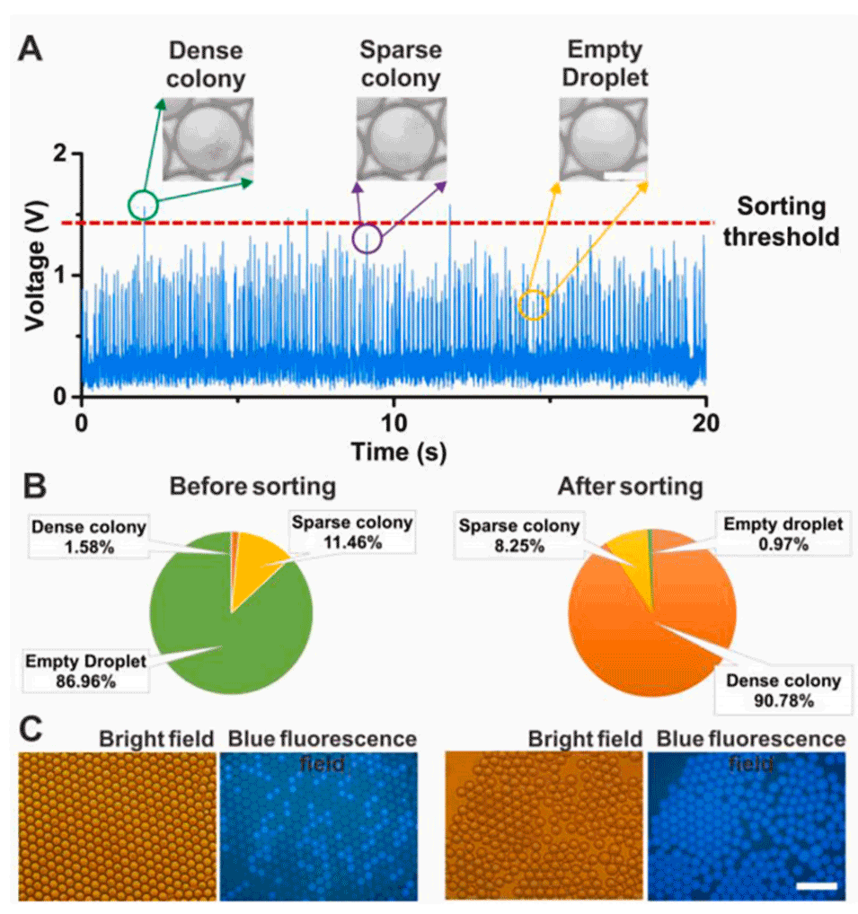 5、这种无需标记的液滴平台为快速微生物生长表型筛选提供了自动化方法,可进一步应用于高质量工业菌株筛选、抗生素耐药性和定向进化等领域。