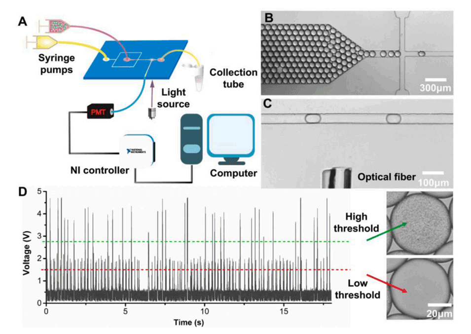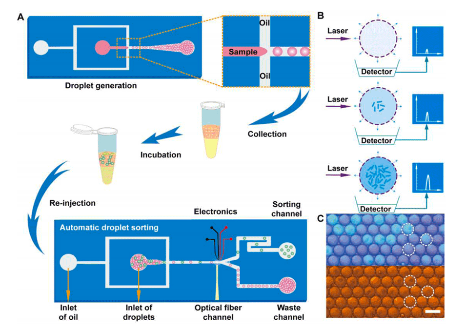 快速、准确的微生物筛选在工业育种、酶定向进化和合成生物学中具有重要意义,但现有的筛选方法耗时且过程繁琐。荧光激活液滴分选(FADS)系统为微生物筛选高通量分析提供了一种有前途的替代方法。然而,使用前需要进行预标记步骤。
