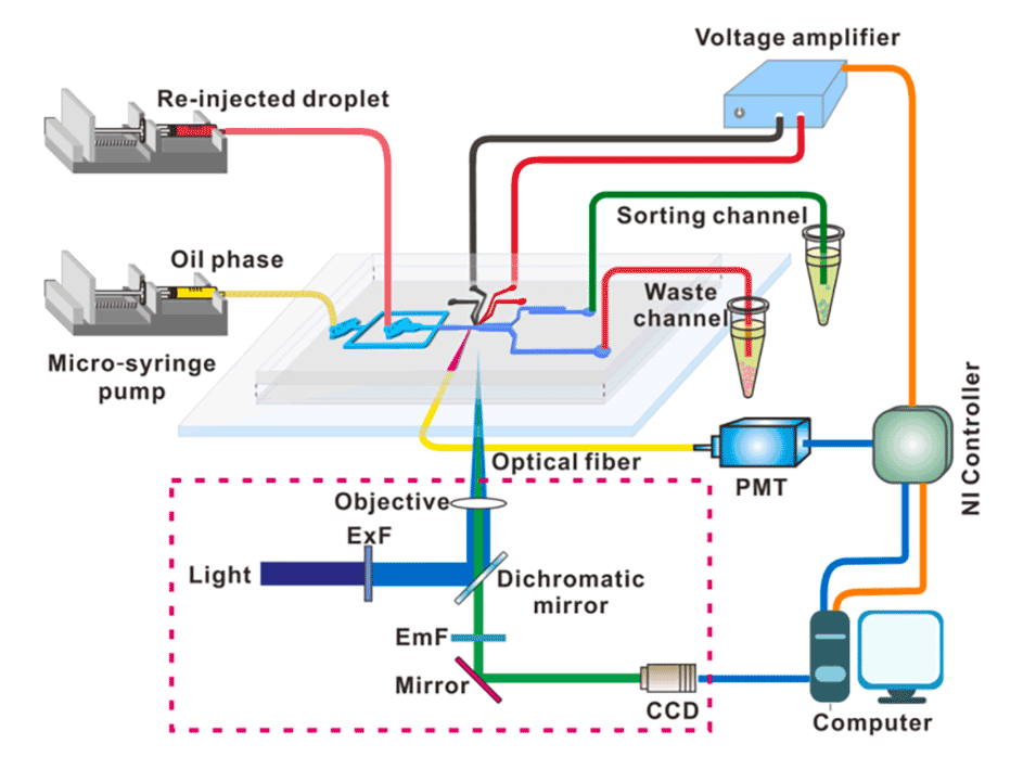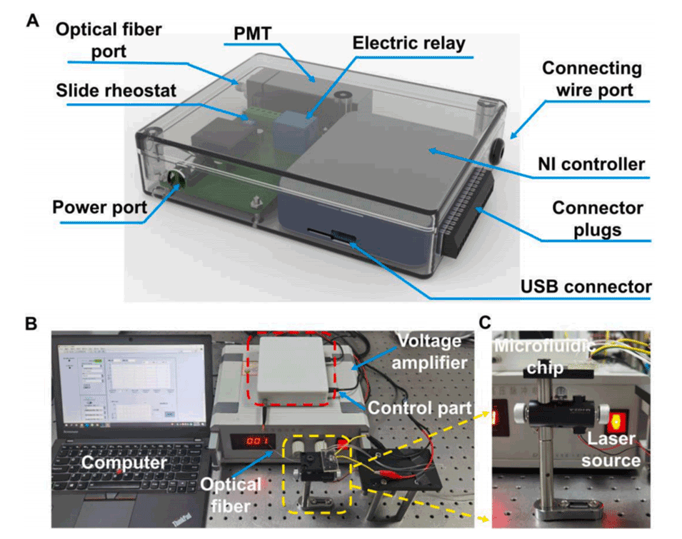 2、该平台将主要功能集成在一个盒子中,液滴穿过检测区域,并通过插入特制芯片中的光纤将光信号直接传输到光电倍增管(PMT)。