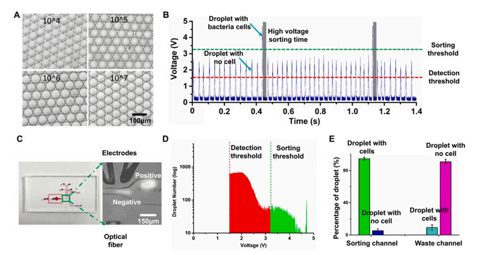 3、在优化芯片结构和参数后,首先验证了该平台的细菌自动计数能力。然后,在电压放大器的支持下,该平台成功实现了对液滴中培养细菌的无标记计数和分选。