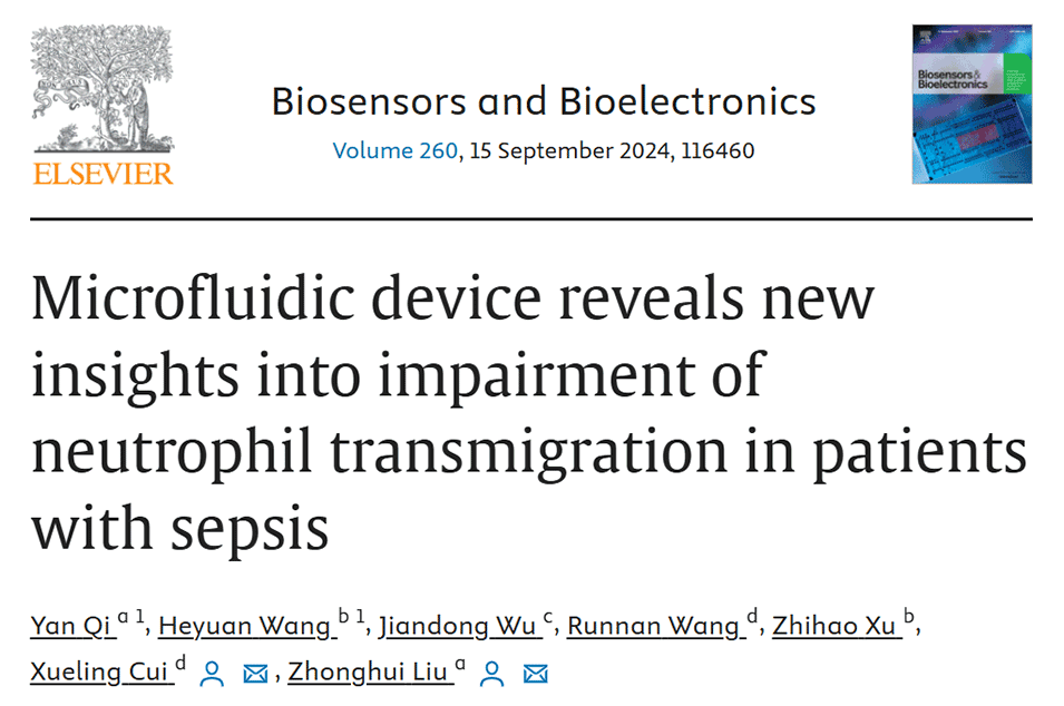 近期,吉林大学柳忠辉教授、崔雪玲教授团队设计了一种具有微米级窄缝的微流控装置来模拟生物屏障,通过该装置能够实时观察和记录中性粒细胞的运动和细胞核变形。此外,还开发了一种形态分析方法,用于量化众多单个细胞的细胞核变形。相关研究以“Microfluidic device reveals new insights into impairment of neutrophil transmigration in patients with sepsis”为题目,发表在期刊《Biosensors and Bioelectronics》上。