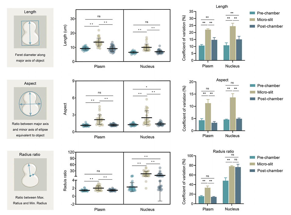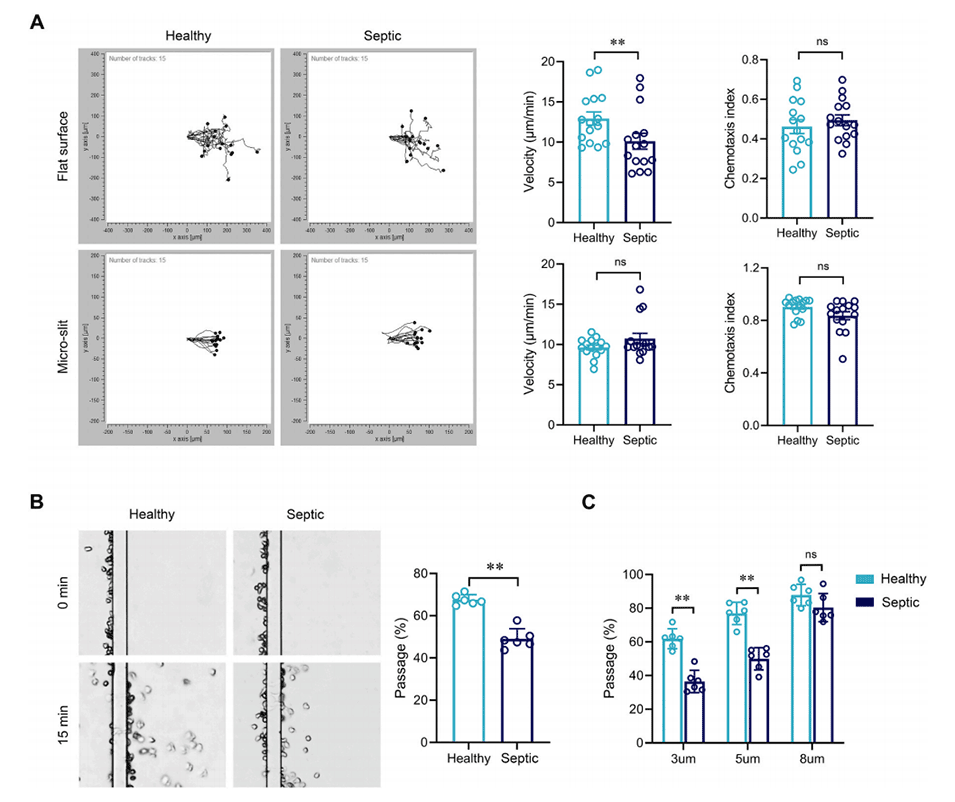 4、这表明脓毒症患者的中性粒细胞迁移缺陷可能与核的变形能力降低有关,此外,还强调了微流控技术在探究病理状态下细胞迁移缺陷方面的重要作用。